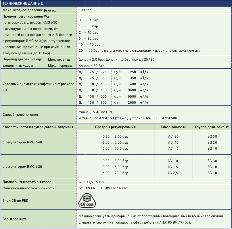 Регулятор давления газа Hon 503 (RMG 503) предназначен для поддержания выходного давления газообразной среды независимо от влияния возмущающего воздействия, входного давления и/или изменения отбора газа в линии регулирования. HON 503 (RMG 503) состоит из регулирующего клапана и функциональных единиц "регулятор" и "предохранительный отсекающий клапан (ПОК)". Установленный перед регулятором фильтр тонкой очистки защищает регулятор от загрязнений.